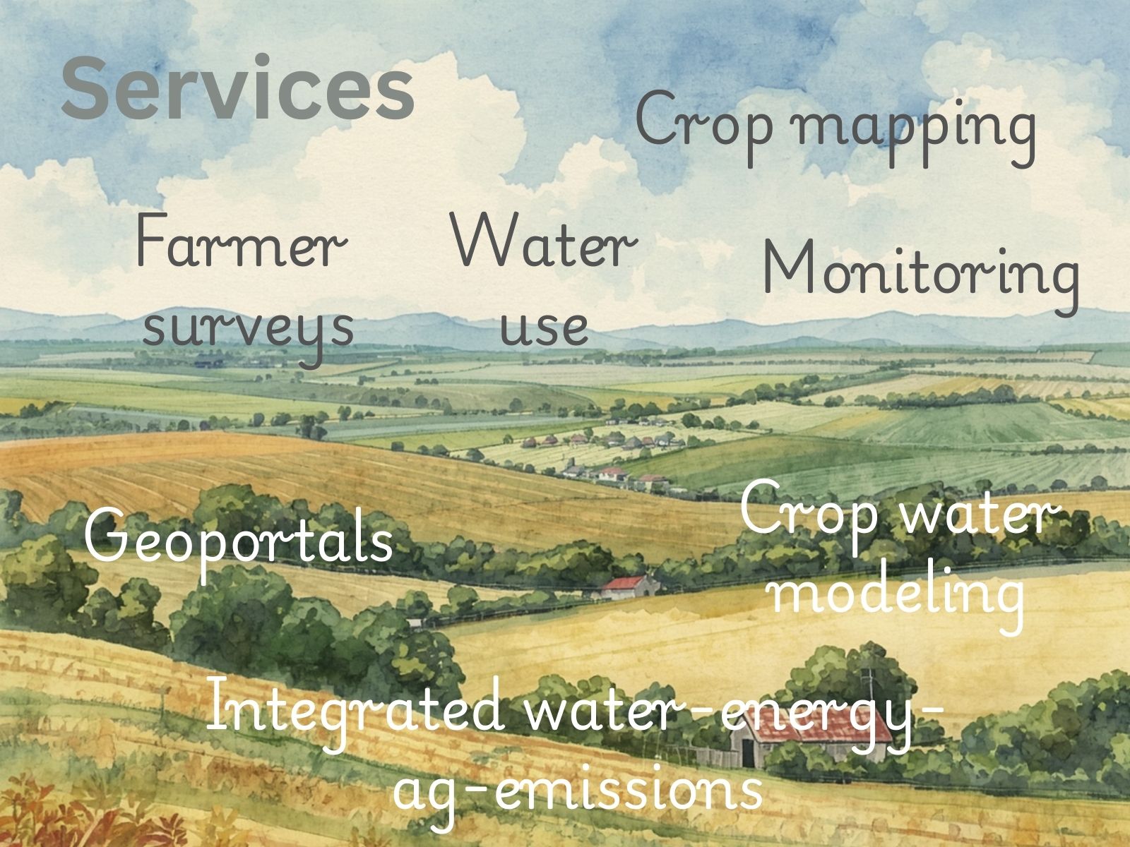 We offer consulting services on solar projects, climate change and water management. We develop models using established tools, data science, AI and satellite imagery applications for land, energy and water management solutions.