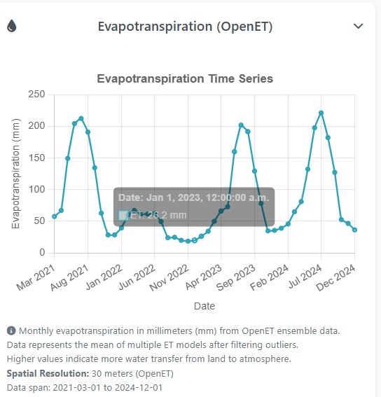 OpenET data extracted for the same field and data, corroborates this inference: Notice the similar cyclical pattern of rising ET through the summer of each year – except 2022, which has very low total ET, again indicating that no rice was grown in this field that year.